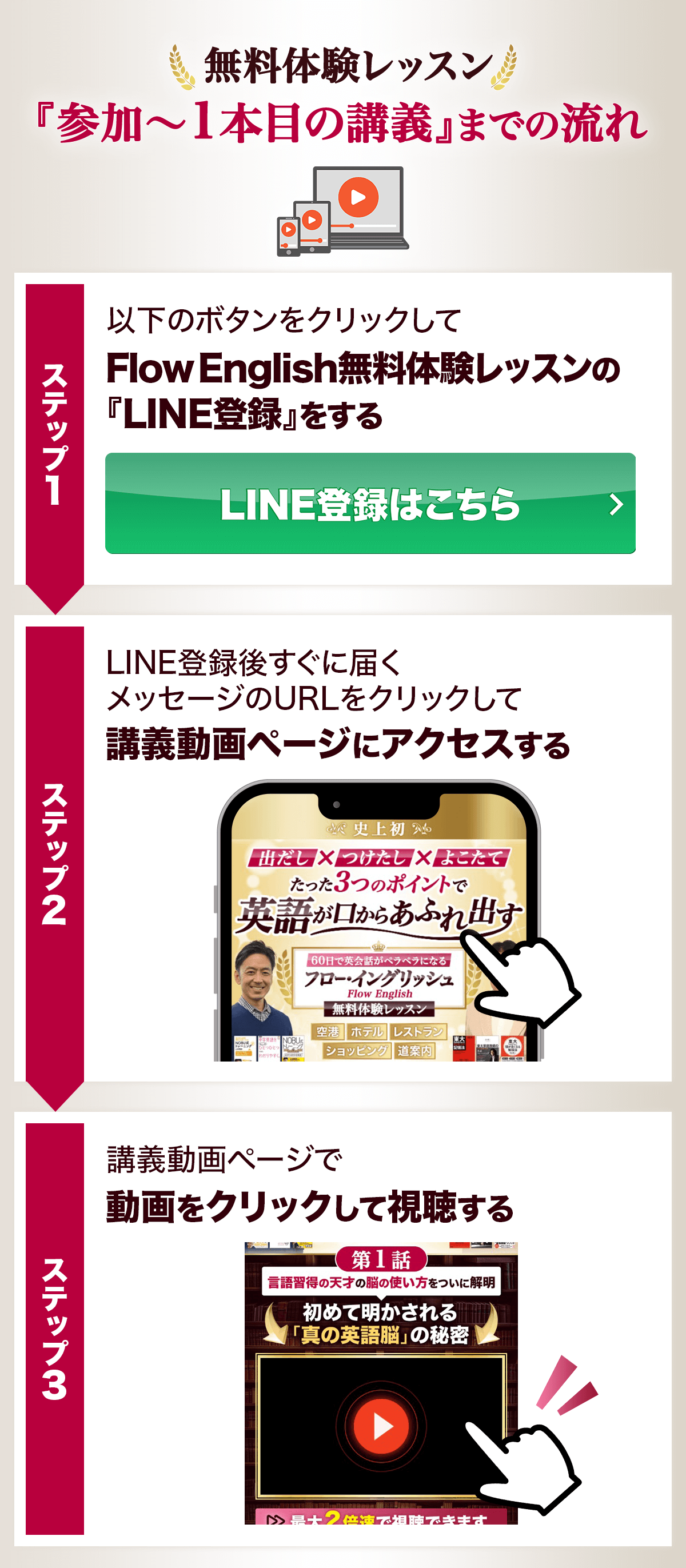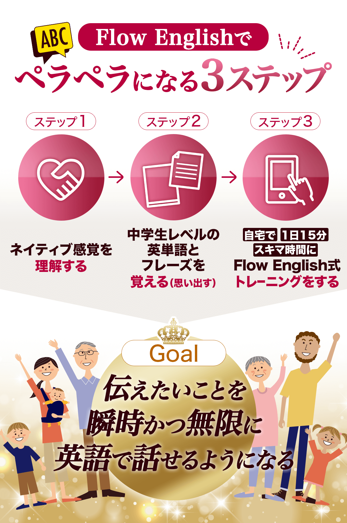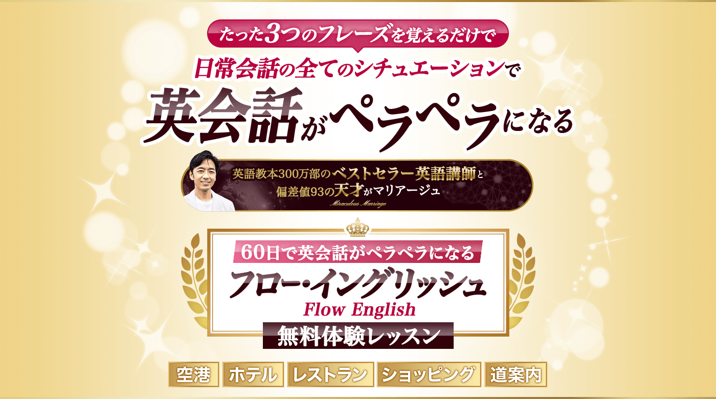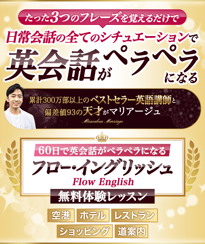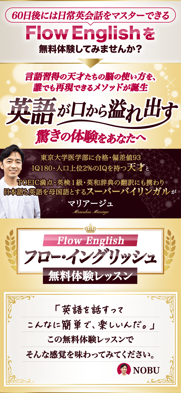 つまり、年齢、経験、センス問わず、誰でも、伝えたいことを瞬時かつ無限に表現できるようになる『真の英語脳』になれるメソッド、それがFlow Englishです。