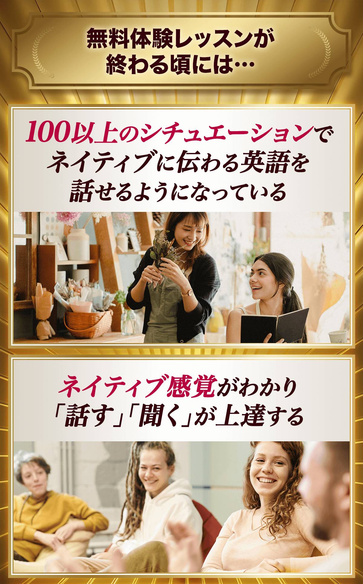 無料体験レッスンが進むにつれ、あなたの中に眠る英語脳が目覚め、面白いほどに英語が口から溢れ出てくる感覚を体験することになるでしょう。