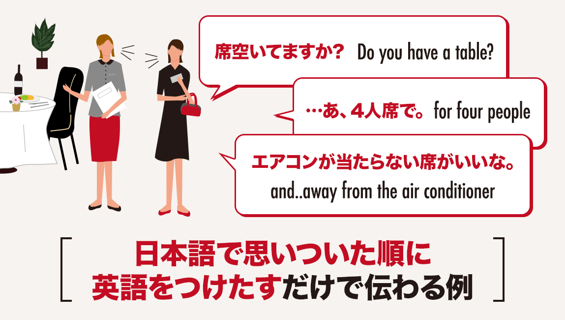 つまり、『伝えたいこと』を英語で言えるようになるうえでは、ある簡単なルールに沿って、日本語を思いついた順番で、英語のフレーズを直感的に『つけたし』ていくだけでも十分なのです。